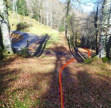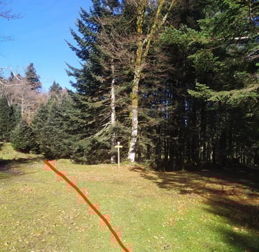 40 m avant cette croix sur arbre nous changeons de direction à droite.