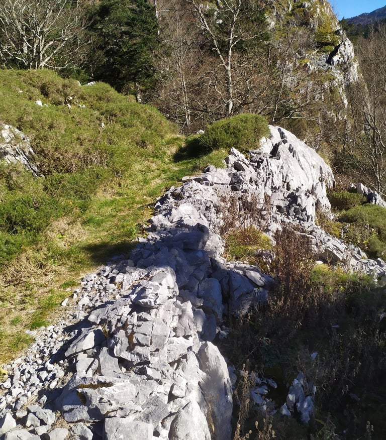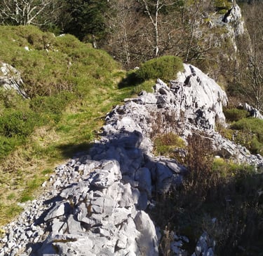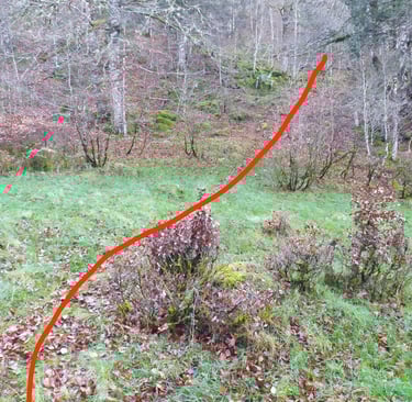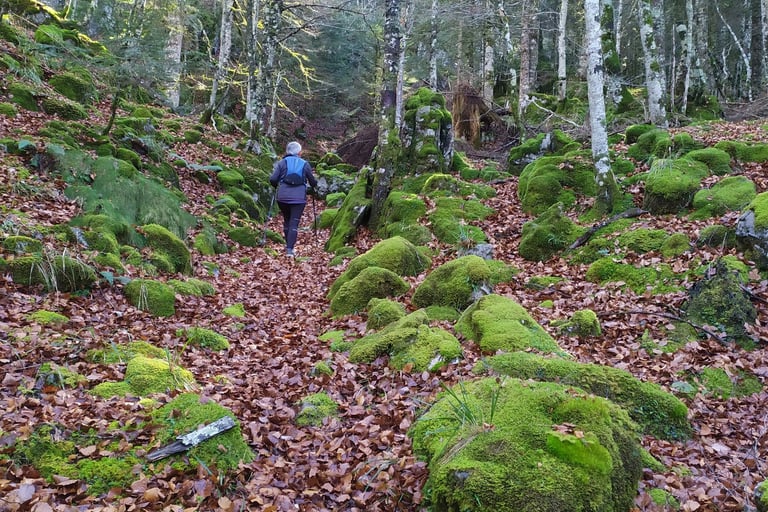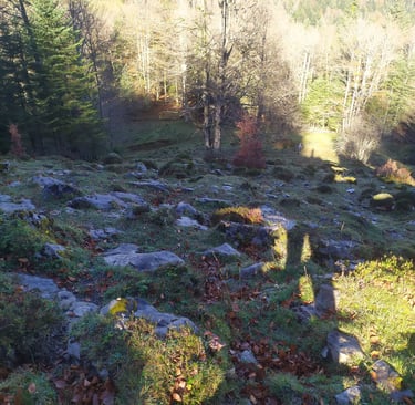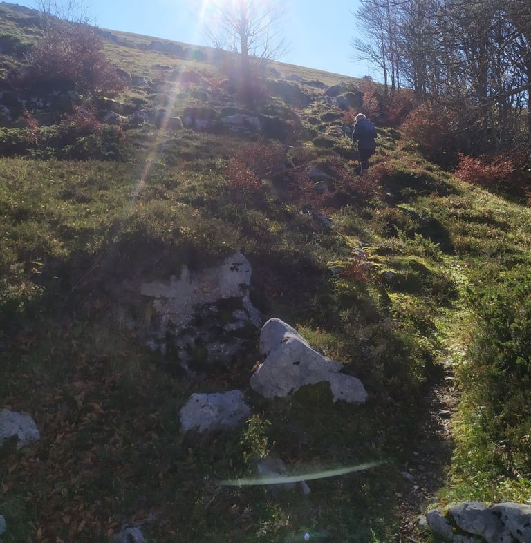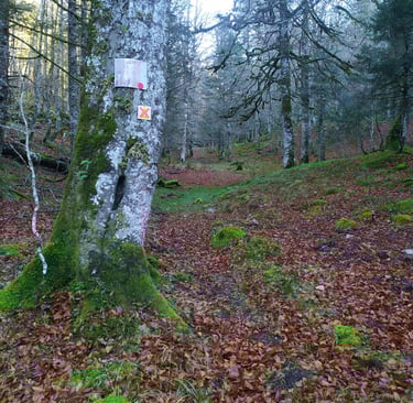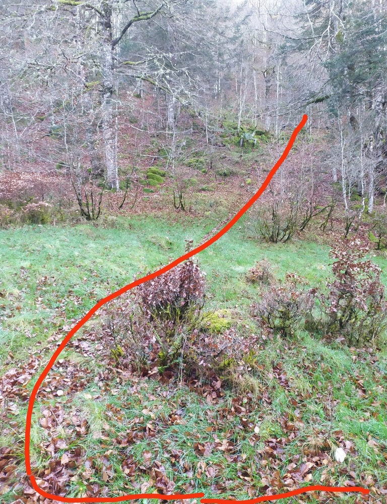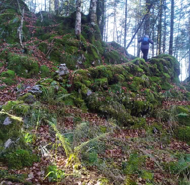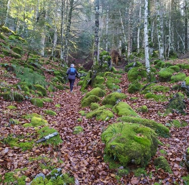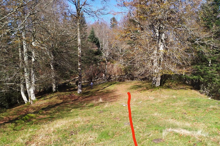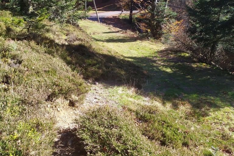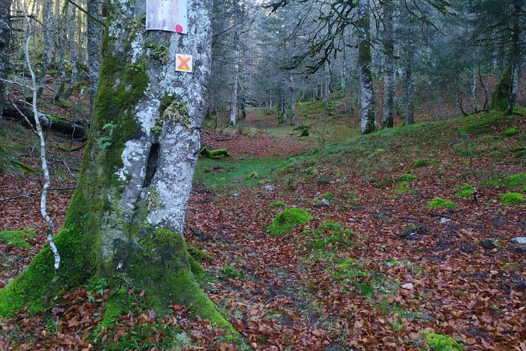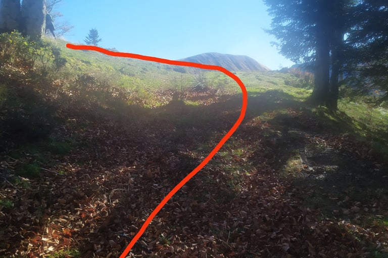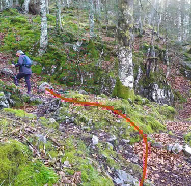 Attention, ce sentier est peu visible et très mal balisé les cairns sont recouverts de mousse et la trace qui serpente parmi les arbres est souvent recouverte de feuilles.