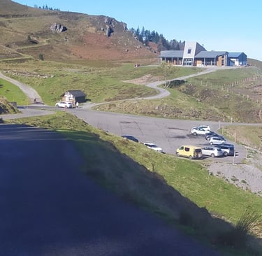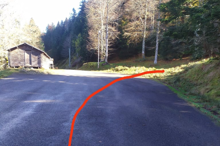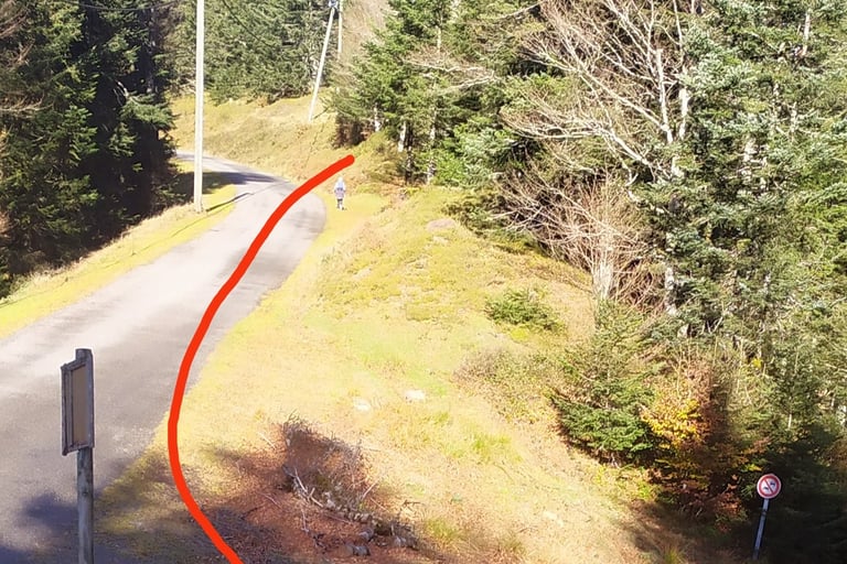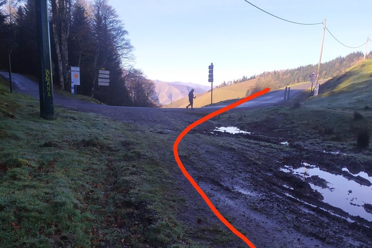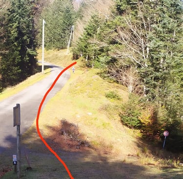 A droite remontez la route sur 1 km en direction de l'ancien chalet d'accueil.