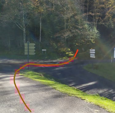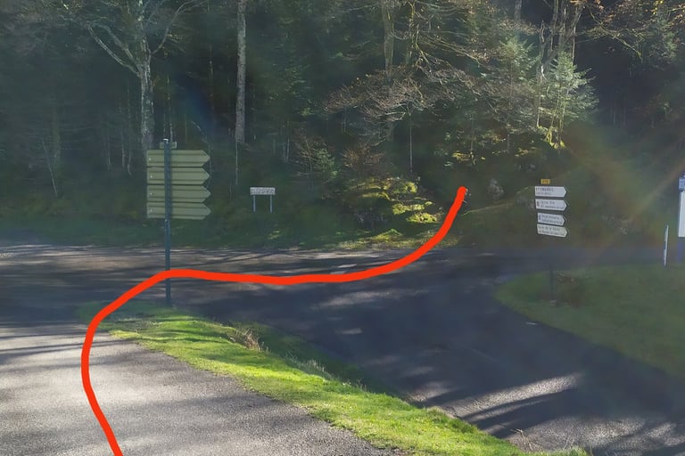 Nous retrouvons la route au point B. Continuer sur le chemin à gauche. Le point B peut être le point de départ d'une petite boucle de ....... km et il offre quelques places de stationnement.