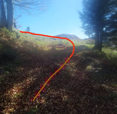 Tourner à droite en direction du Sud Est, remonter le coteau et nous allons retrouver le sentier qui, avec encore 200 m de dénivelé va nous conduire au Soudet.