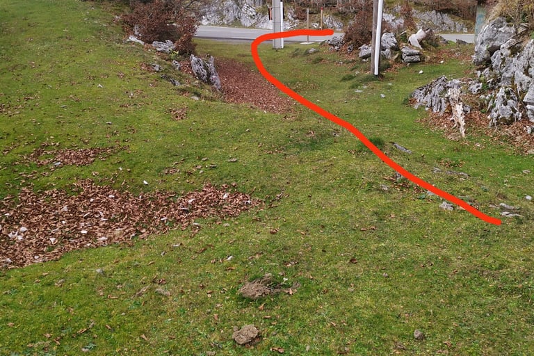 Marcher une centaine de mètres sous la ligne électrique, la laisser à gauche et descendre dans un large espace rocheux.