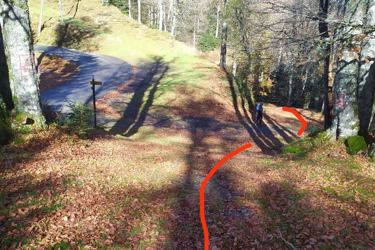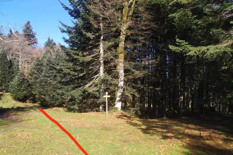 Le chemin évolue dans la forêt à droite en contrebas des crêtes, ici au carrefour du sentier vers Chousse.