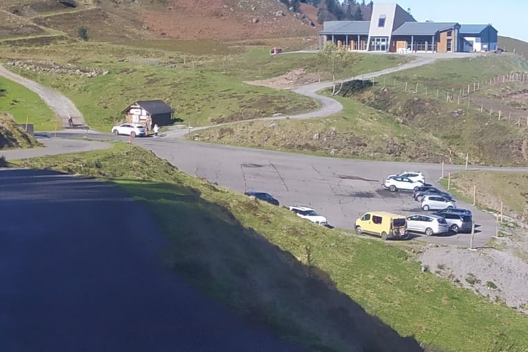 Arrivée au col de Hournères. Ici deux possibilités : à gauche retour au point B par les crêtes d' Issarbe. à droite par la route, escale au refuge restaurant Le Grand Tétras.